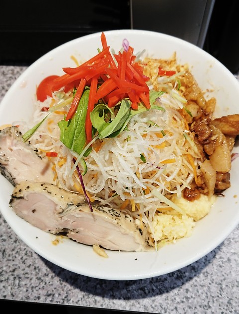 まず野菜がもやしと違い、大根や赤玉葱、人参、水菜、プチトマト。チキンは分厚いのが二つ。低温調理ですね、ハーブもバッチリ効いてます。美味しいです。