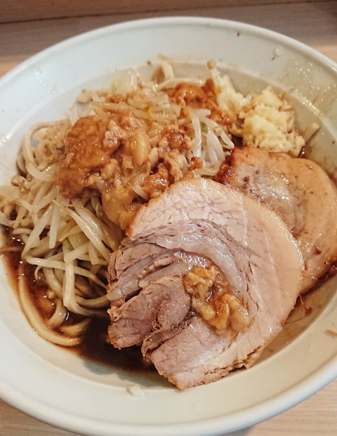 麺は相変わらずの平打ちな極太麺。ゴワゴワなアルデンテで美味しいですよ。二郎系での麺はトップクラスかと思います。凍めたらなお良さそう。