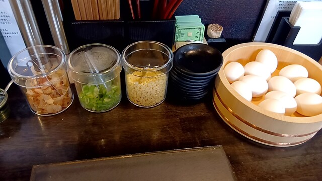 卓上に鰹節、ネギ、揚げ玉、生玉子があり使い放題。
