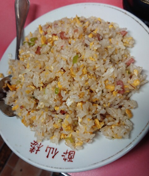 続いてチャーハン。もう見て笑いそうになりました。全然半じゃない。コチラも並盛り以上あると思います。玉子、ネギ、チャーシューとシンプルな具にしっとり系の炒め具合。塩分も丁度よい。