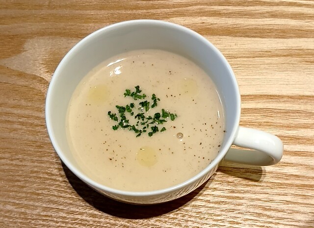 先にポタージュが配膳。その後6.7分してご飯とカツ。ポタージュはじゃがいもですね。食べる機会ほぼないので基準が分かりませんが普通に美味しい。大人子供好きなやつ。