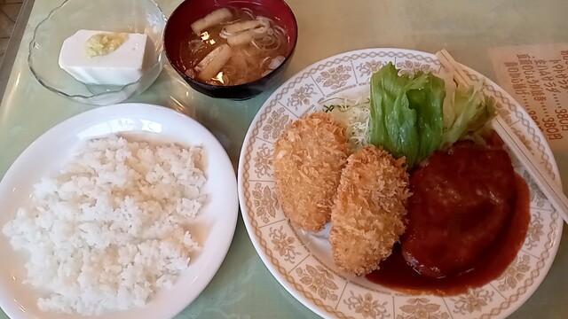 ハンバーグは肉の密度が凄い。つくねみたいな食感。ジューシーさはないですね。ややパサつきがある。個人的にはあまり好きなタイプではないです。こうゆうやつに出会いたくないから普段ハンバーグチョイスしないんだよなぁ。気まぐれでするもんじゃないな。