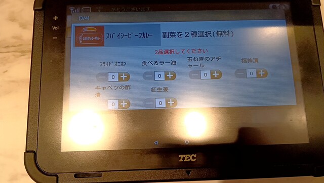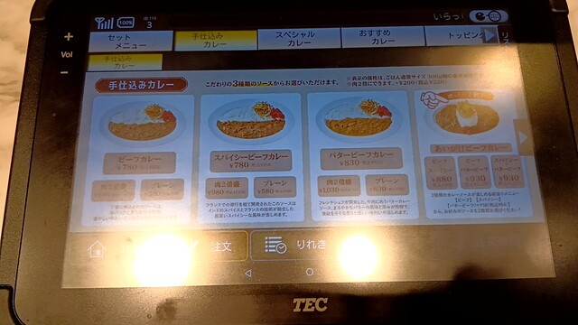 オーダーはタッチパネルから。カレーは3種類。ビーフ、スパイシービーフ、バタービーフ。その他はトッピングやセットメニューですね。まぁ結局はビーフカレーだけなんですけど。吉野家だからこそ。